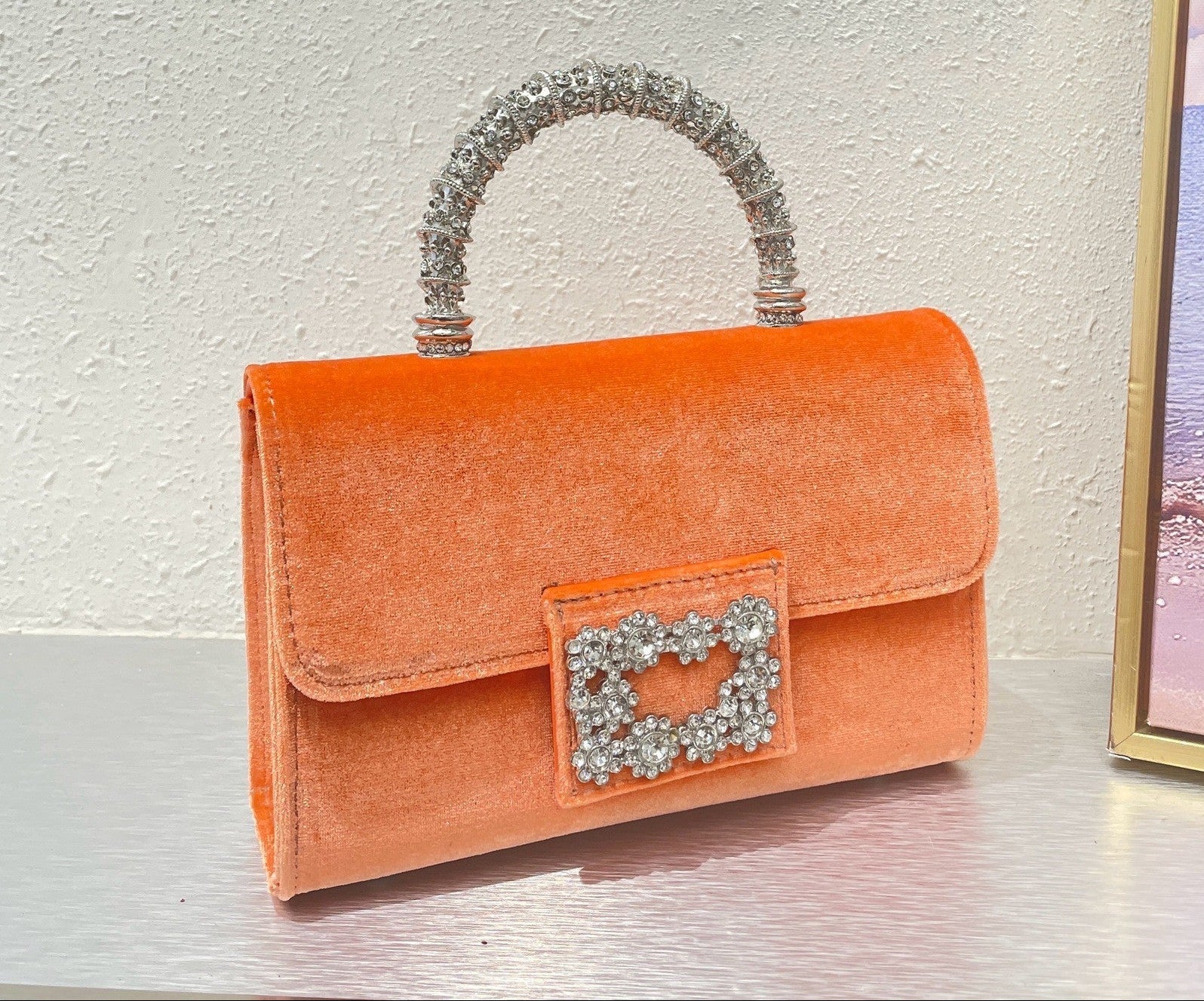 Laissez-vous séduire par ce sac à main en velours orange éclatant, une pièce qui allie douceur, audace et raffinement. Son anse ornée de détails scintillants et sa boucle incrustée de cristaux en font l’accessoire parfait pour illuminer vos tenues, du brunch au soir chic.